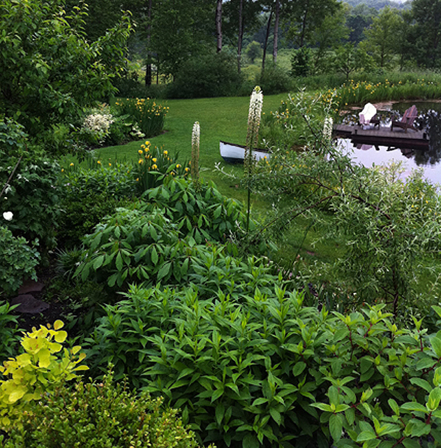 I have used the idea of repetition in every garden I have designed from roof top terraces to gardens that encompass many acres. It does not have to be one plant that is repeated, it can also be the same color of different flowering plants that is repeated which adds a textural element that can be very beautiful and interesting. See photo of the Moon Garden which is primarily planted with white flowering plants, variegated and silver foliage plants. I have planted the native Flag Iris – Pseudacorus throughout parts of the white garden and around the pond to tie the planting together. The repetition of white flowering perennials and variegated foliage mimics the meadow plants in that the planting is cohesive- not jarring!