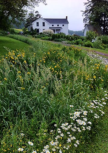 What can we learn from observing meadows and how can we apply that knowledge to create something equally beautiful in our own gardens? First of all, Mother Nature likes to repeat the same plants through large areas. It doesn’t matter where you look: forest, mountains, beach or along the interstate, plants are repeated. At any given time in the meadow there are two to six plants flowering at the same time. In June, the fields are still full of buttercups, but now common vetch (bluish purple) Daisy, Bedstraw (creamy white) and Red Clover are starting to flower. In amongst these flowers are meadow grasses and several beautiful native grasses which I have yet to figure out what they are called. Each of these wildflowers is repeated across the whole meadow in large organic cloud like- shapes. That cohesion and repetition is what is so pleasing, nothing jars, everything flows one to the other again and again. Taking a cue from Mother Nature, I have left un-mowed areas in my garden where there are difficult slopes to mow. The only maintenance is cutting back the area in the fall with a Weed Whacker to spread the seeds for next year’s display. It’s a perfect design solution because I don’t want an overly manicured garden- it would not fit with the rural setting. Integrating the wildflowers into the garden helps merge the wilder parts of the landscape with the tamer parts of the garden.