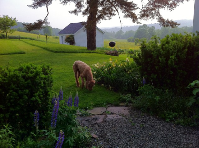 When planting, I spaced the trees out about 15’feet apart because I want them to arch into each other when they are mature. Plum trees stay relatively small reaching a height of 12- 15’high and wide. All the varieties I chose have a beautiful blossom in the spring- delicate pink to white flowers and different colored plums, red, yellow and blue. I decided on a mown path down the center of the orchard and to leave the grass high on each side. I made another mown path near the bench end to cross the long path and give access to the stone steps that lead to a shed. Approximately every three weeks, I mow the high grass on the highest level of the lawn mower. I want the different heights of grass because it creates a strong architectural element to the space, and equally importantly, reduces some of the mowing. The garden bench at the end creates a focal point and has a nice view back down the small avenue. The crab apple tree by the bench was planted several years ago and will only get wider and more wonderful with age. After two months of letting the grass grow, the wild flowers started to show themselves: Indian paint brush, daisy, clover and some of the other meadow plants are shooting up through the taller grass.