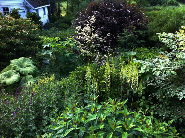 At this point in the season, things are really starting to come together. Lots of perennials and annuals are flowering, but I would like to show some of the plants I use for a “pause- affect” in the border. I find that “big leaf- plants” allow the eyes a resting place before moving onto the next flowering group of plants. Evergreens also work in a similar fashion. Just like when an artist creates “negative spaces” in a painting as a place to retreat before moving through the picture again; a gardener also can use larger flatter shapes in the border for a similar result. Big leaf plants are a great way to achieve this. Gertrude Jekyll was the first gardener to talk about “making pictures” in her garden at Munstead Wood. She was a painter and a photographer and part of the Arts and Craft Movement in England. When I think about most art forms: music, poetry, architecture, etc, I believe all these forms have the equivalent idea of a resting place, in which to pause, and then re-enter the art form.