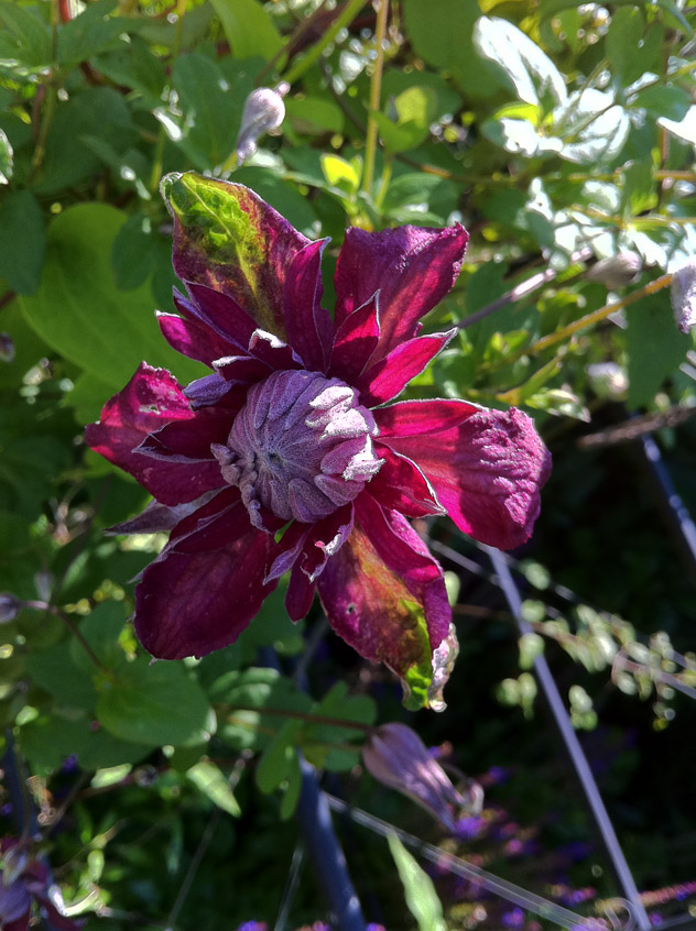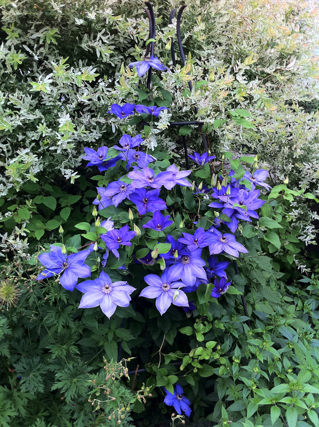 It’s early July, and the clematis are flowering. Some are prolific bloomers and a few are looking a bit straggly. It’s my fault because I did not get a delivery of composted manure until very late in the season. I must remember to feed the vines in the fall or early spring.
