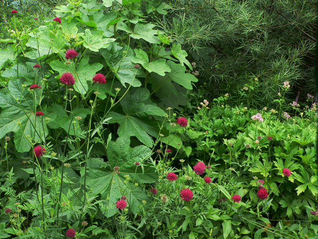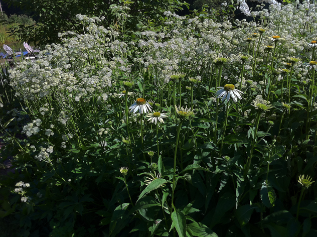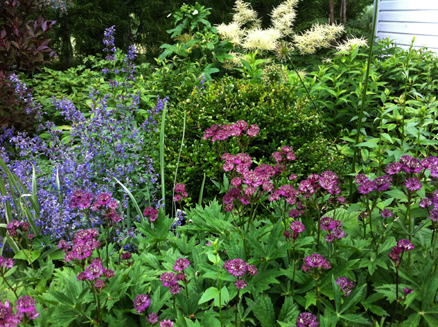 Most perennials only bloom for 10-14 days. I am always looking for perennials that have a long flowering time. I have found a few that really produce flowers for several months. The top plant on my list is Astrantia- Masterwort. It’s a meadow plant that can be found in many parts of Europe. There are three types, each a different color and habit. Astrantia major is a white flowering variety and though it says in most books it reaches a height of about 2’ feet that was not the case with me. Having had the plant in the garden for about six years, mine have grown to about 3 ½- 4’ feet. It’s the tallest variety. I have a pink one that is called Astrantia M. Roma which has hybridized with Astrantia major and is a slightly paler pink than the original one, but just as tall. The third Astrantia m. ‘Claret’ is a very deep wine colored and stays relatively small about 15”- 18” and blooms much earlier. Astrantia Major pretty much bloom all summer and if I cut them back in August- they just keep flowering.