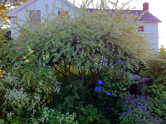 I have been wanting to rip out the Salix Integra “Hakoro Nishiki’ for a while now. In fact this fall, my plan was to take a chain saw to it. There would also be a lot of work removing its roots which was a daunting task. Each year, I cut the shrub back two to three times taking off about 4’feet each time. It had become a blob and was taking over it’s allotted space. In early June (see first photo) the leaves are very white and I find that jarring in relationship to rest of the garden. In mid July, the plant settles down & the leaves turn a speckled pale yellow- off white.