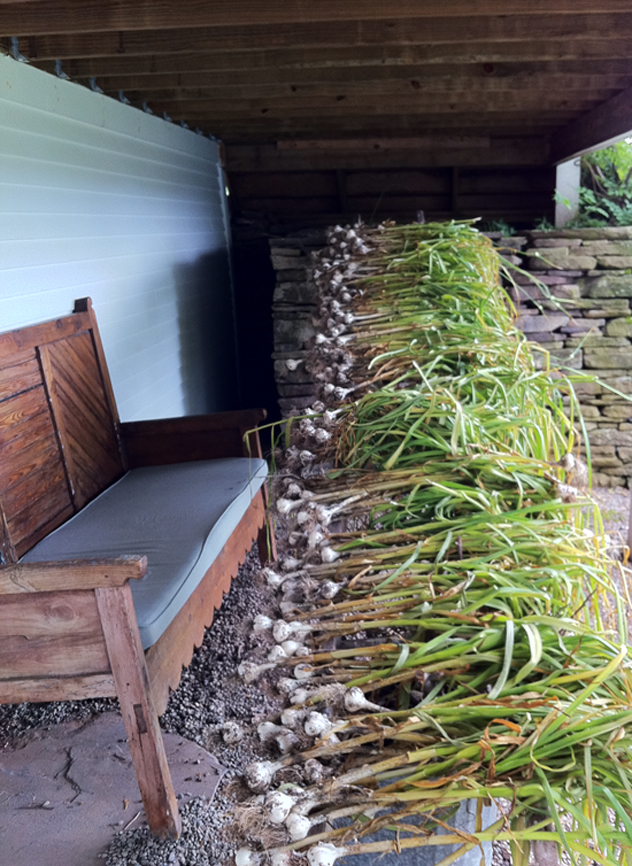Curing garlic on an old ladder under the porch-out of the weather