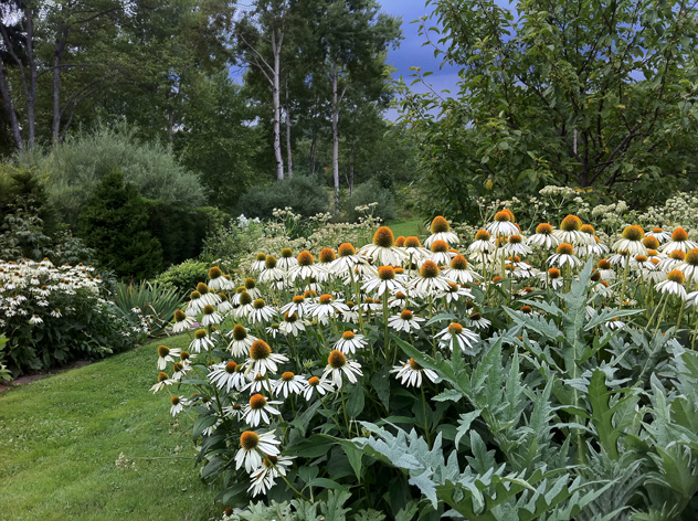 Echinacea white swan and artichoke foreground, Rosemary Willow in distance