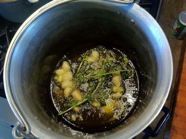 In a large pot heat olive oil ( I like to use quite a bit) , throw in 10 cloves of peeled garlic  cloves and bunch of basil.  Remove basil when leaves are crispy. Continue to brown garlic. Remove garlic. Turn off heat. The cooked garlic and basil flavor the oil.