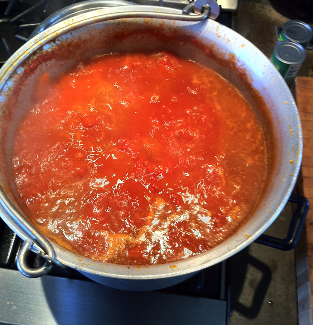 Bring heat to high and reduce sauce by about ½. Keep stirring pot while you reduce sauce to prevent bottom of pot from burning.  Takes at least an hour to reduce this much sauce maybe longer.