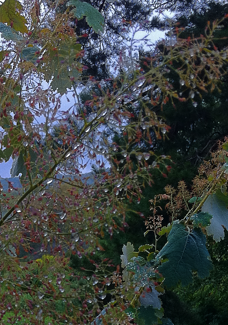 There are Plume Poppies outside my painting studio-(Macleaya). Raindrops sit like jewels on their bluish leaves and seed heads.