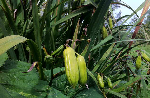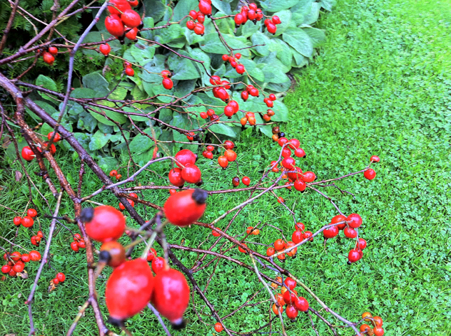 This year, I am particularly aware of all the beautiful seed heads. I had never noticed the large pumpkin colored seed heads dancing above the Aesculus N. Paviflora before. And the lime green pods of the Iris pseudacorus-yellow flag Iris are spectacular drooping towards their reflections in the pond. For me, autumn in the garden is all about the beautiful fruits that appear on the trees and shrubs. I never have seen apple trees so laden down in fruit. A large 10 foot limb has snapped from the weight of its bounty in the orchard. The fruit of the crabapple and the bright hips of the Rose Rugosa and Rosa Glauca make a beautiful show against the tired perennial borders. One last bow before the play ends.