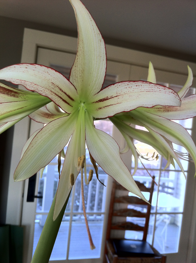 The generic name Amaryllis applies to bulbs from South Africa, usually grown outdoors. Each year with the loss of daylight and so much time spent inside the house I find myself picking up a few amaryllis kits usually found in grocery or large discount stores.  The choice in the stores where I live is generally limited to red, pink or white, which are lovely, but this year for something a little different, I ordered some unusual varieties from a bulb company. I like to plant three of the same bulb variety in a large terra cotta pot, that way you can have flowering going on for weeks and weeks as the bulbs tend not to bloom simultaneously.   They take about 8-10 weeks to flower once you pot them up. So far the pot of Amaryllis Faro has been going on for 5 weeks with a lot of flowers still to come.