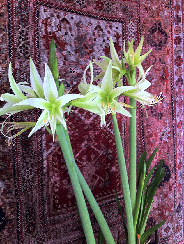 The Cybister Amaryllis Evergreen has more of a daylily- shaped flower and the delicate greenish white petals really glow and brighten up the darkest room. I have kept these in a room that stays quite cool and these flowers have also lasted for weeks. They often need to be supported with sticks and string once they start flowering as they get quite leggy. Next year I am going to stagger planting the pots of bulbs so I have a pot in bloom throughout winter.
