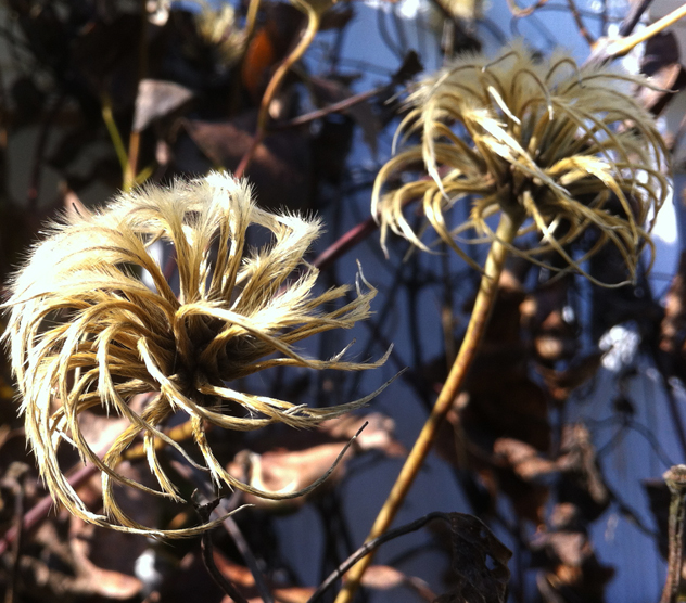 I have also been busy filling bowls and jars of seeds from flowering annuals and bi annuals: Nicotiana, Nigella-love-in-a mist, and the pale yellow flowering Russian hollyhocks to name a few. My favorite seed head belongs to the Clematis vine. The feathery forms remind me of the hairdos of 1960’s pop singers and makes me smile.