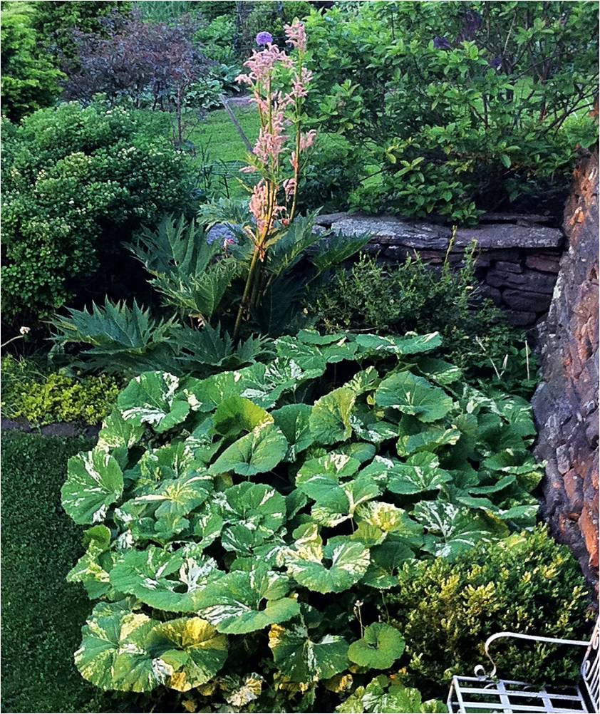 Rheum-palamtum tuangusticum 7′ feet tall & petasites varigatus-