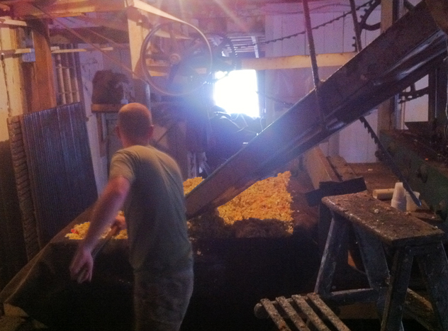 It was a sunny autumn day when we drove over several Catskill mountain ranges to the Hubbell farm, a large complex with many barns and out buildings. We were met by members of the Hubbell family who are all incredibly friendly and showed us where to drop off our apples near the press. The apples are first washed, and then travel down a wooden conveyer belt to the hopper, where they are mashed. The mashed apples go down to a lower level of the barn through a chute that pours the crushed pulp into large frames, which are then wrapped in heavy felt. Additional frames are added for each layer of mashed apples, and eventually the whole thing is pressed by a thousand pounds of weight. The fresh apple juice flows down to a holding tank on the ground floor and is then fed through a hose into 5 gallon containers. Our 32 bushels produced 2 gallons a bushel and we ended up with 64 gallons of beautiful fresh cider juice.
