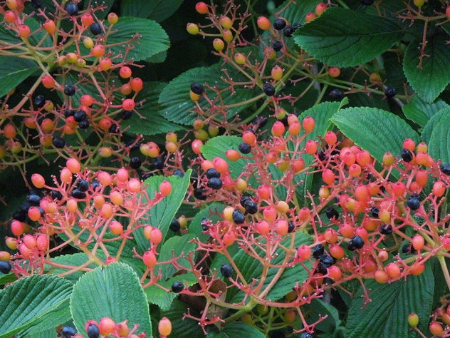 I have planted more viburnums than any other species of shrub in my garden and this is why: besides having attractive foliage, viburnums offer showy, often fragrant flowers, and the majority have beautiful fall color and fruit that appeal to the eye but also attract wildlife. Designing garden rooms that have “two seasons of interest” is a love of mine and these beautiful shrubs fit that requirement. Most ornamental shrubs  have the one season, but viburnums come alive in midsummer and in early fall give a second showing of beautiful fruit just as the other plants are giving up the ghost. The doublefile viburnums, especially, offer a beautiful aesthetic to the garden with their horizontal branching. Viburnums are as versatile as a shrub can get: trees, shrubs, evergreen, semi-evergreen, deciduous, large (60 foot) and small (3 foot); the flowers, white (most), pink, fragrant, smelly,  no discernible odor; the fruits, yellow, orange, red, blue, purple and black. If you can’t find at least one you like then seek out professional help!