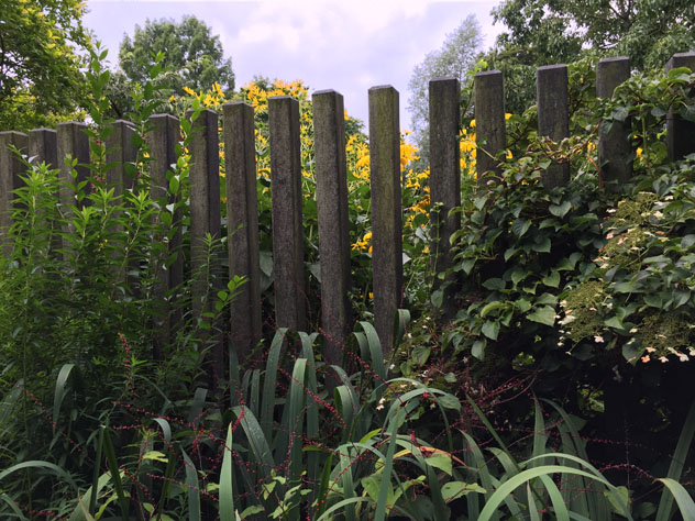 Ruys was fortunate to grow up on her father’s Bonnes Ruys’s nursery called Moerhein which translates to ’the house on the peat.’ Bonnes’s first grew crops and shrubs that led over time to the development of a very well known perennial nursery. One of his clients was the English gardener Gertrude Jekyll, who Mien met, and attributed her love of color in the garden to Jekyll’s influence. Mien was exposed to Arts and Crafts gardens known for their highly formalized design of laying out gardens in rooms. Arts and Crafts garden rooms are usually entirely enclosed by walls or hedges. Ruys takes this idea and plays with it by planting a hedge as a backdrop, but leaving a small gap which allows the viewer to see beyond the garden room – a tease of what is to come. Her use of positive and negative space is implemented over and over in her designs. In one of her rooms she planted yews around a reflecting pool leaving gaps between the rectangular shapes; not only playing with negative and positive shapes, but also creating a dark and light pattern. In another garden she laid a brick path along a border that eventually fades fanning out into the grass. In the marsh garden called ‘Gardener’s Garden’ she used equidistant vertical concrete fence posts to create a modern sculptural fence. I loved seeing some pollarded willows repeated over a long stretch enclosing one of the garden rooms. By repeating patterns she knitted the gardens together.