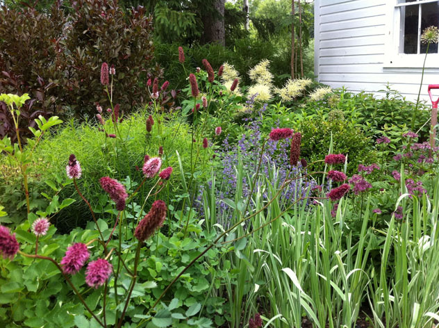 Iris variegates in front not in bloom, Astrantia ‘Ruby’s Wedding” far right, Sanguisorba obtusa front left, Nepeta ‘Six Hills Giant’ center.