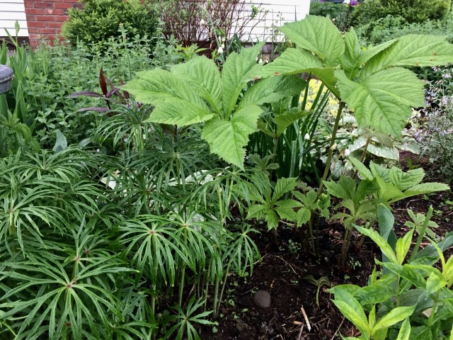 Rodgersia pinnata has a slight ochre color to the new leaves as they stretch and rise above the surrounding perennials like a giant hand. This perennial feels ancient like a plant that might have been around when dinosaurs roamed. Another giant is Rheum palmatium tanguticum which reaches a height of 6’ft. or more with enormous serrated leaves emerge at the base and the stunning red flowers rocket above the foliage and last from late May into mid June. I planted Synelesis aconitifolia next to a bird bath because the leaves remind me of a splash of water. Another beauty Darmera Peltata – Indian rhubarb is a tall rounded rhubarb reaching a height of 4′ and adds a lot of texture to the border. I planted it in a boggy border where I lost many plants and I am happy to report it is filling in the spot nicely (it will take full sun if the soil is consistently wet.)