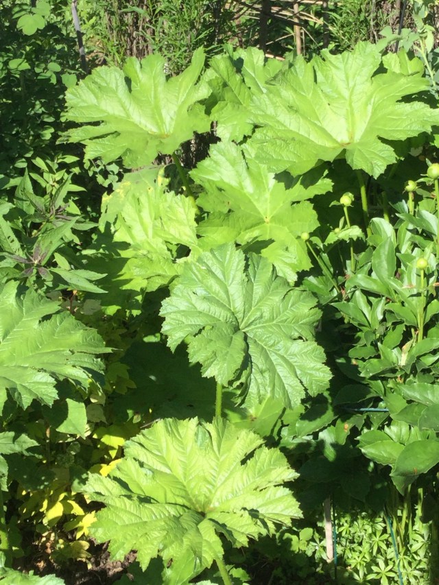 I bought Asilbioides tabularis by mail order and have divided it every year for the past ten years. It is a wonderful large rounded leaf plant with some of its leaves can easily reach a width of 30″ inches. Perfect for shade areas where the flat pale green adds light to a dark area of the garden. I first heard of Peltoboykinia wantanabei in a garden talk. The plant is new to my garden, and still getting established but I love it’s serrated leaves and look forward to it filling the space I have given it. BEWARE- Petasites Japonicus known as butterbur, or sweet coltsfoot is a rhizomatous perennial and extremely invasive. I planted this at the base of a tall retaining wall where I could control it by mowing over the escapees. Asarum European – wild ginger is a low growing ground cover with glossy deep green heart shaped leaves. I love contrasting it with variegated foliage. Aralia cordata- Sun King has beautiful chartreuse foliage that really adds brightness into a shade border. By adding a few of these large leaf foliage plants to your flowering perennial borders you will not only add interest, and give breath to take in the more complex shapes and colors of the surrounding perennials.